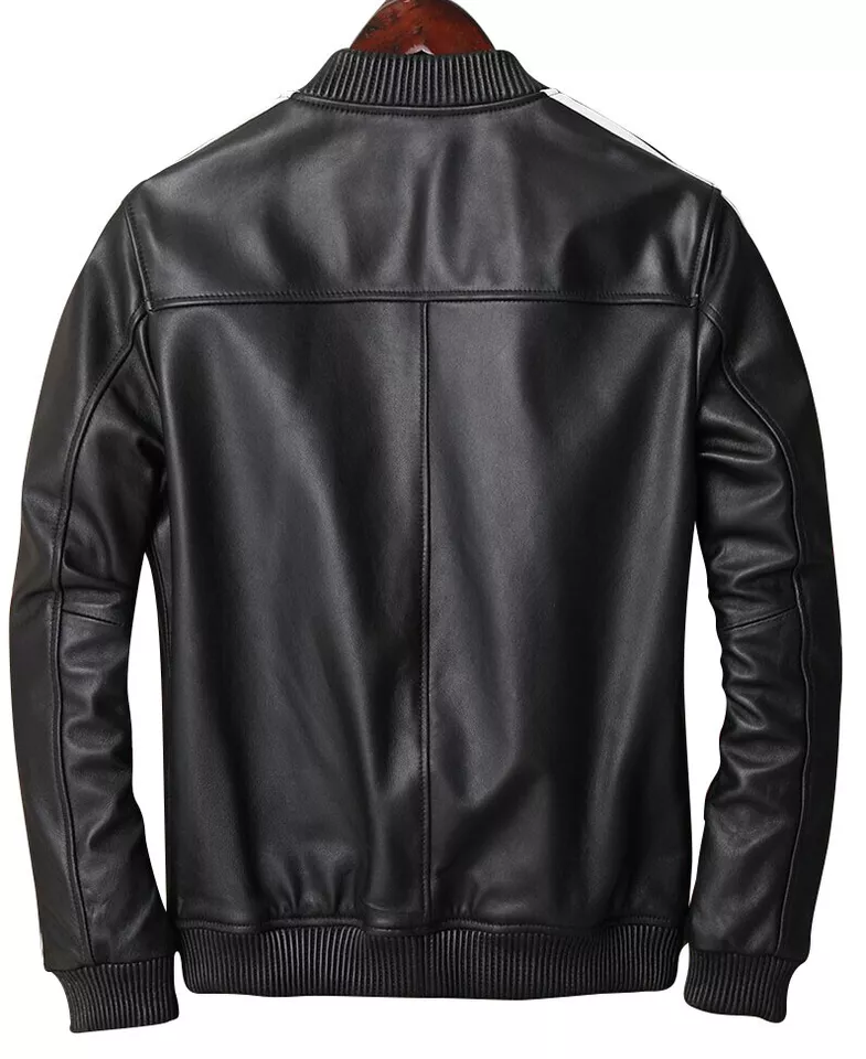 Mens Bomber Real Sheepskin White Strips SlimFit Cafe Racer Black Leather Jacket